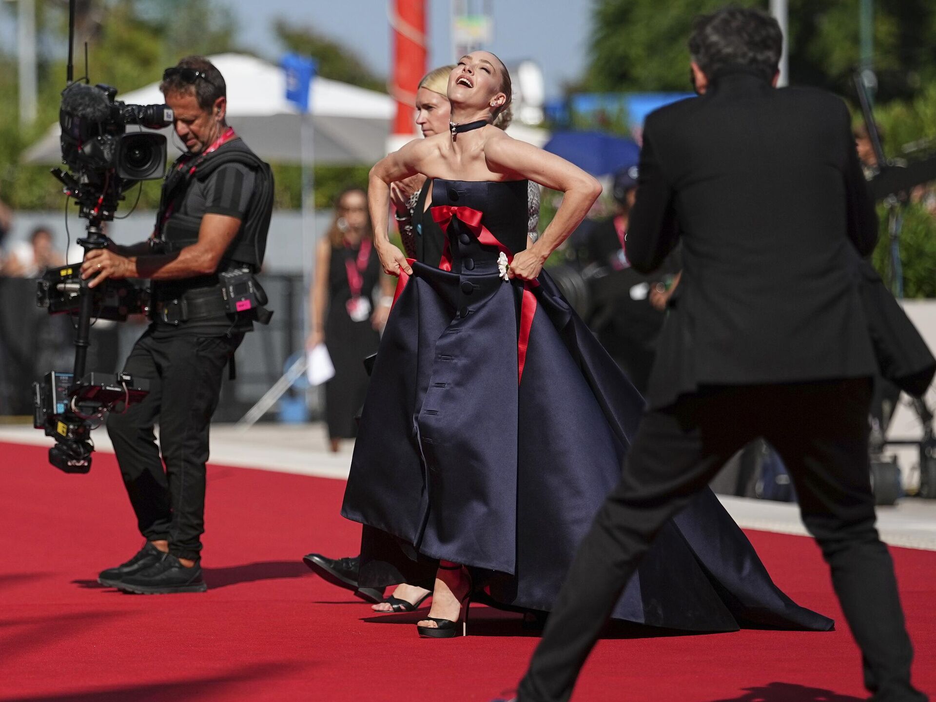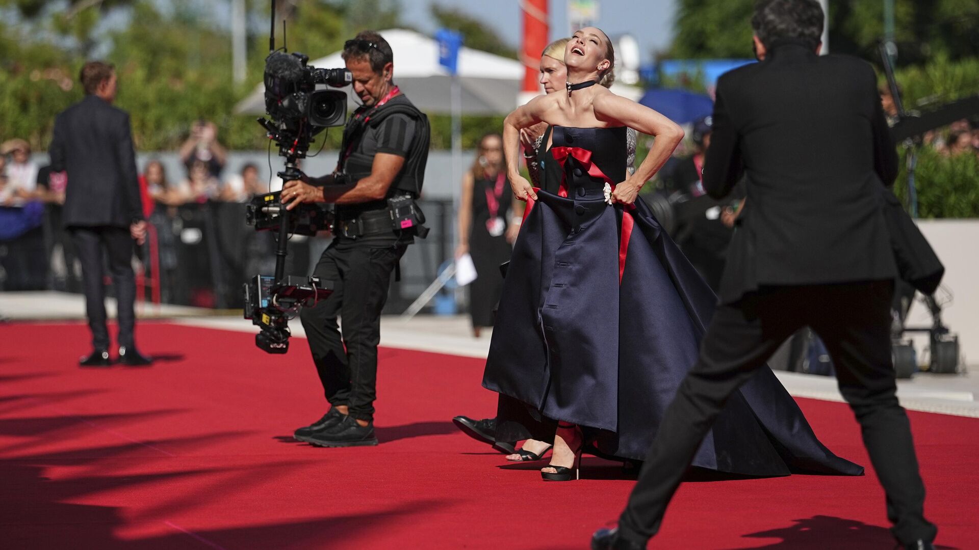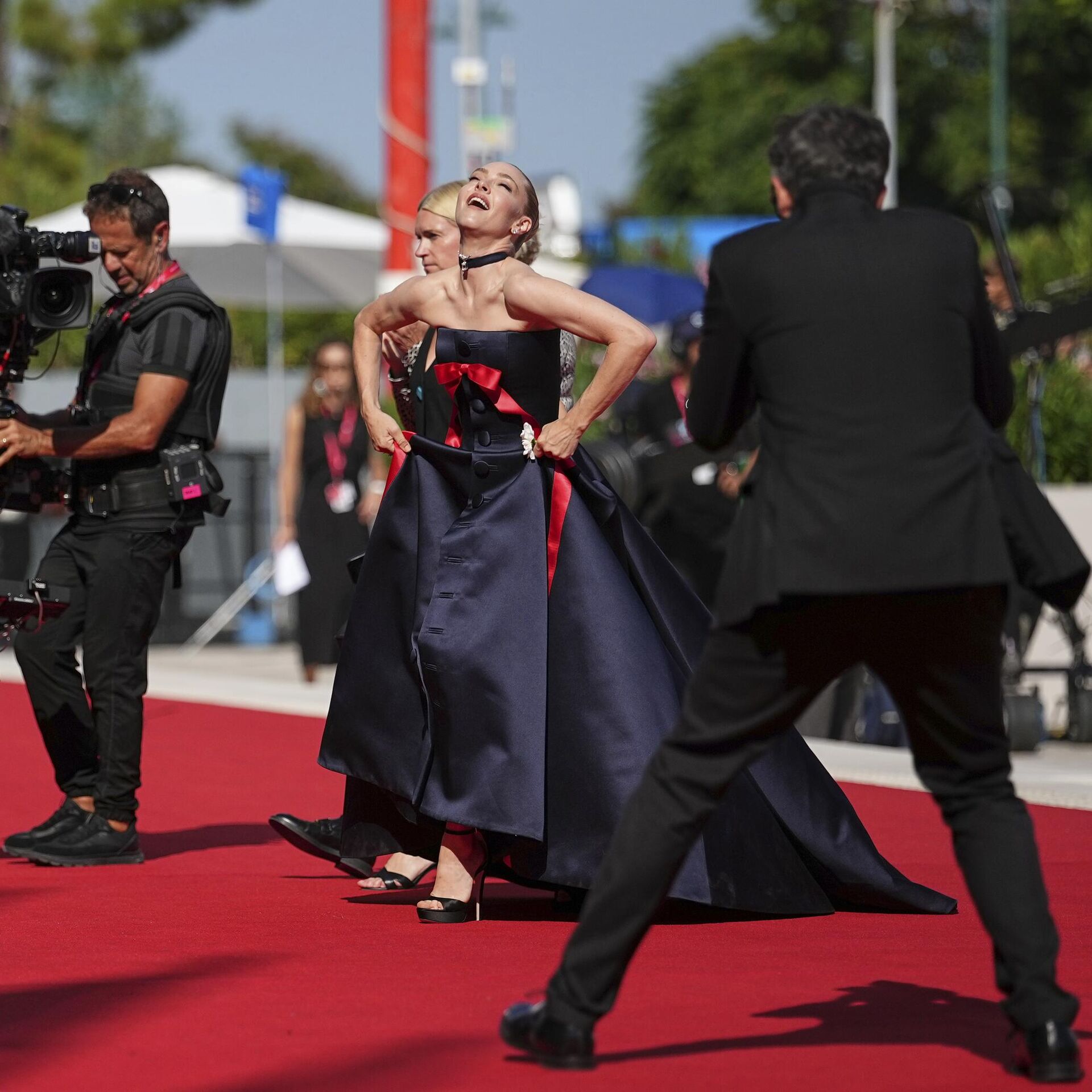 Аманда Сейфрид позирует фотографам на красной дорожке 82-го Венецианского кинофестиваля.