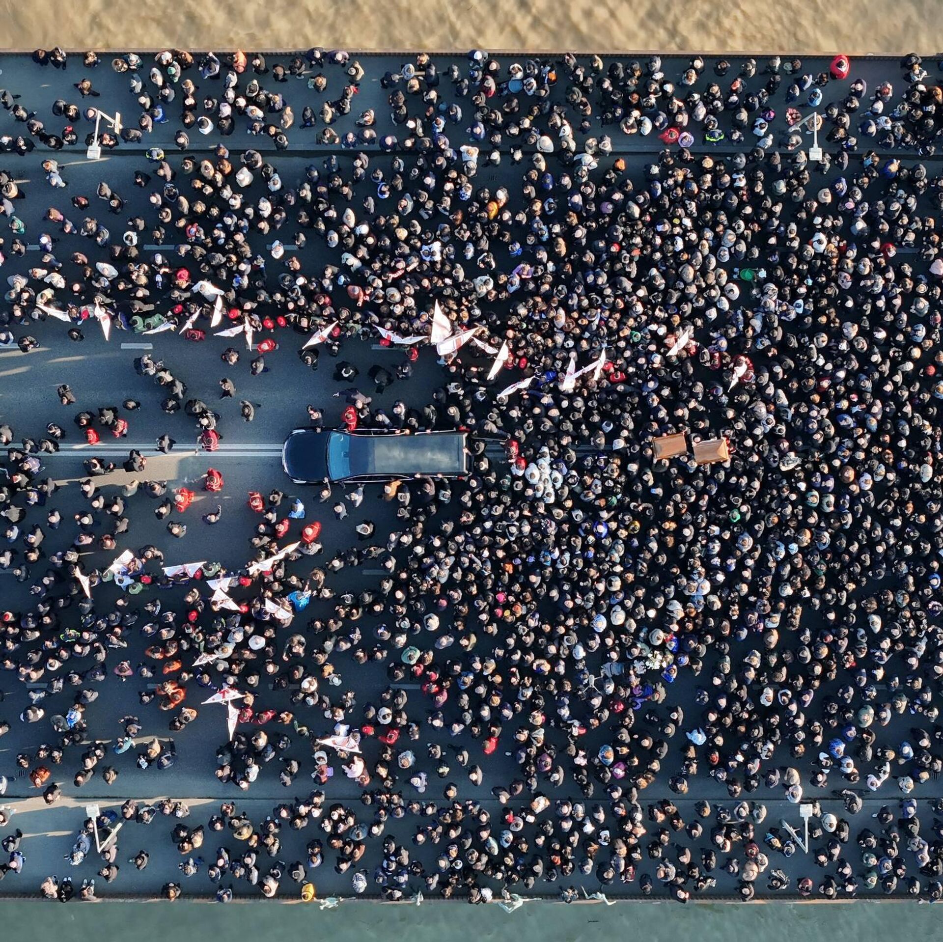 Шествие сопровождают тысячи людей – набережная перекрыта, движение регулирует полиция. Люди несут свечи, иконы и цветы, многие не скрывают слез. Для них Илия II был не только религиозным лидером, но и моральным ориентиром в самые сложные периоды новейшей истории страны.